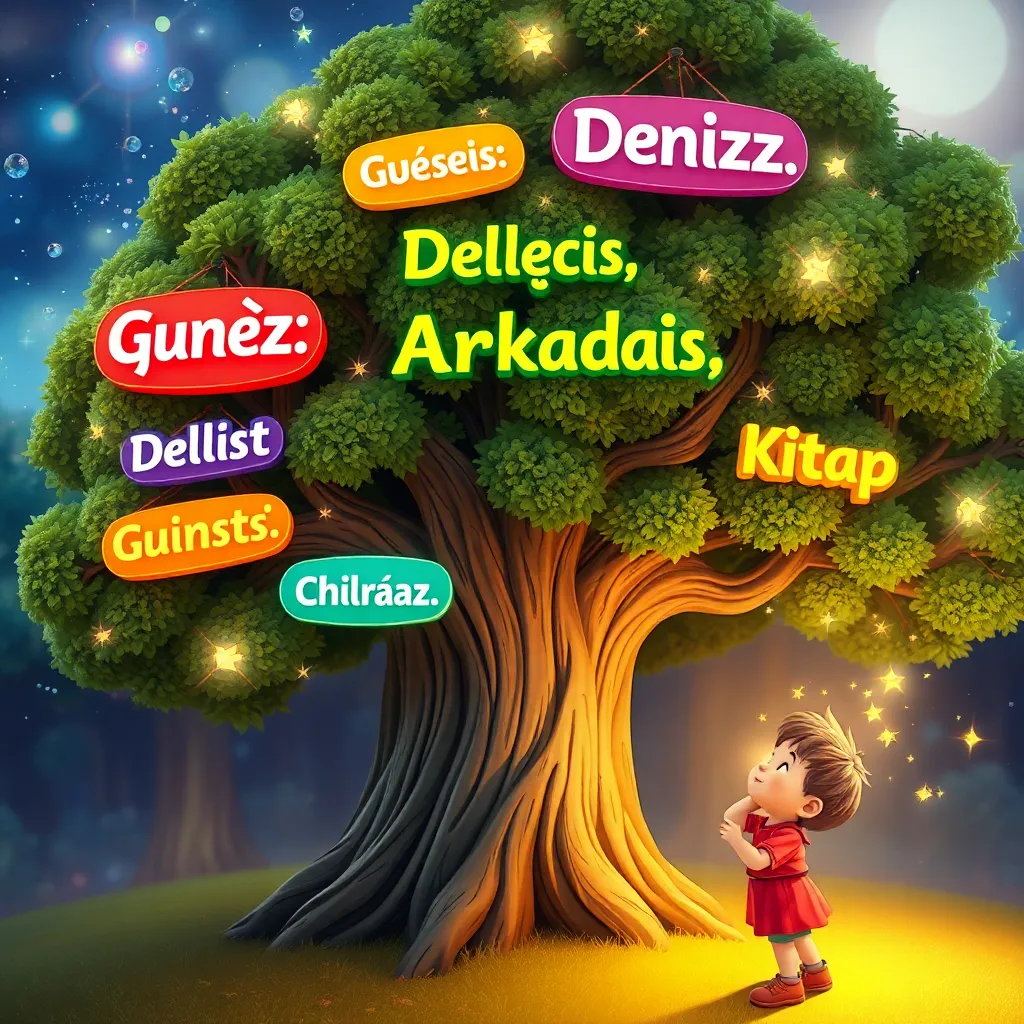 Efe heyecanla denemelere başladı. 'Güneş' dediğinde altın sarısı bir baloncuk, 'Deniz' dediğinde mavi turkuaz bir baloncuk oluştu. 'Arkadaş' kelimesi pembe, 'Kitap' kelimesi mor oldu. Her baloncuk havada dans ediyor, sonra yavaşça bahçenin köşesindeki eski meşe ağacının dallarına takılıyordu. Kısa sürede ağaç, rengarenk kelime baloncuklarıyla süslenmiş bir Noel ağacına dönüştü. Efe ne kadar çok güzel kelime söylerse, ağaç o kadar güzelleşiyordu.
