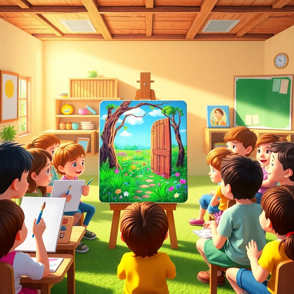 Birkaç gün sonra, okulda resim dersi vardı. Öğretmenleri, 'Hayalinizdeki en güzel yeri çizin,' dedi. Lina hemen fırçalarına sarıldı. Kağıda, rengarenk çiçeklerle dolu bir tarlayı, ortasında ışıldayan gizli kapıyı ve kapının ardında uçan kitapların, konuşan hayvanların olduğu bir dünyayı çizdi. Can ise dev bir futbol stadyumu çizdi. Herkes resimlerini bitirdiğinde, öğretmen hepsini duvara astı. Lina'nın resmine bakan diğer çocuklar, 'Vay canına, bu kapı gerçekten var mı?' diye sormaya başladı. Lina, 'Siz de gözlerinizi kapatıp onu hayal ederseniz, belki görürsünüz,' dedi.