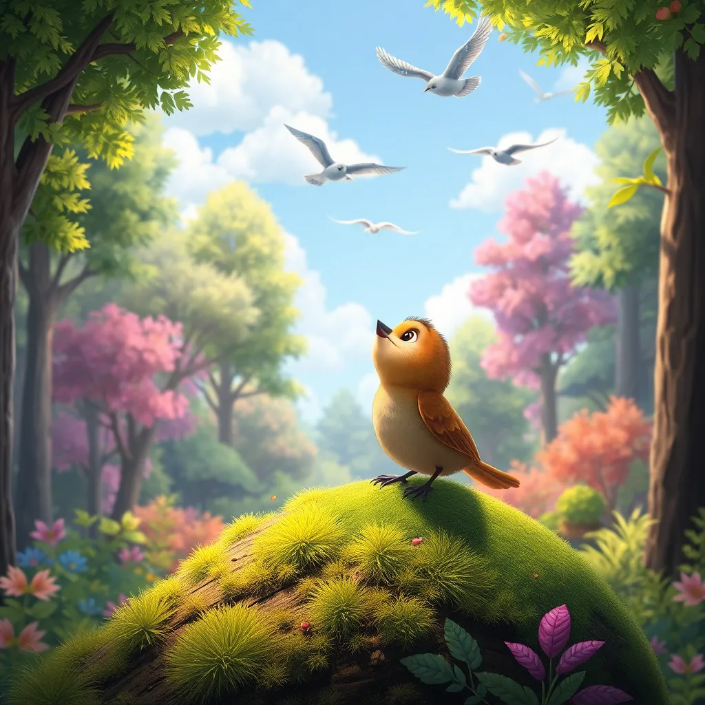 Bir zamanlar, Gökkuşağı Ormanı'nda yaşayan minik bir kuş vardı. Adı Cıvıl'dı. Cıvıl, tüyleri kahverengi, gözleri iri ve parlak, sevimli bir kuştu. Ama bir farkı vardı: Cıvıl'ın kanatları çok küçüktü ve uçamıyordu. Diğer kuşlar gökyüzünde süzülürken, o hep aşağıda, yerde kalıyordu. Buna rağmen, Cıvıl gökyüzünü çok seviyordu. Bulutların şekillerini izler, güneşin doğuşunu ve batışını hayranlıkla seyreder, geceleri yıldızları sayardı. En büyük hayali, bir gün gökyüzüne çıkıp bulutlara dokunmaktı. Arkadaşları ona, 'Üzülme Cıvıl, belki bir gün kanatların büyür,' diye teselli ederlerdi. Ama Cıvıl sabırsızdı; beklemek istemiyordu. Bir gün, 'Ben de gökyüzüne çıkmanın bir yolunu bulmalıyım!' diye karar verdi.