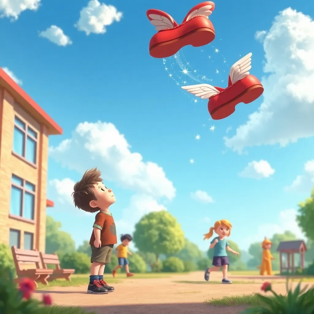 Okulda, teneffüs zili çaldığında bütün çocuklar bahçeye koştu. Can da arkadaşlarıyla oynamak için dışarı çıktı. Birden, havaalanından gelen uçak sesine benzer bir ses duydu. Ses yukarıdan geliyordu. Başını kaldırdığında inanamadığı bir manzara gördü: Kayıp kırmızı ayakkabıları, minik kanatları çırparak gökyüzünde uçuyordu! Ayakkabılar, arkalarında gümüş renkli bir iz bırakarak havada dans ediyor gibiydi. Can 'Ayakkabılarım! Bekleyin!' diye bağırdı ama onlar bulutların arasında kaybolmuştu bile.