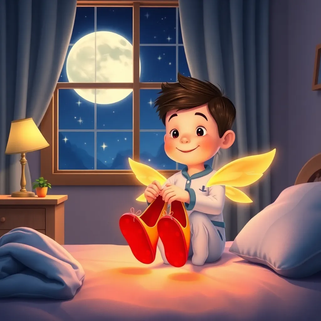 O akşam, Can penceresinden dışarı bakarken ayakkabılarının tekrar görüneceğini umuyordu. Tam yatmaya hazırlanırken, odasının penceresinden hafif bir tıkırtı sesi geldi. Perdeyi aralayınca, kırmızı ayakkabıların pencere pervazında durduğunu gördü! Üzerlerindeki minik kanatlar hala hafifçe titriyordu. Can yavaşça ayakkabılarına yaklaştı ve onları eline aldı. Ayakkabılar sıcacıktı ve içlerinden yumuşak bir ışık yayılıyordu. Tam o sırada, ayakkabılardan minik bir ses duydu: 'Bizi giy, sen de uçabilirsin!'