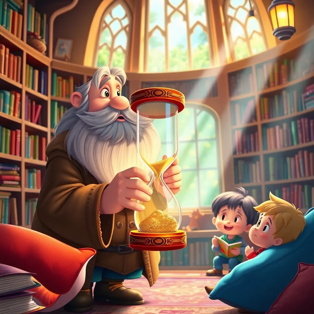Kum saati düzeldiğinde, Dede Zaman'ın gözleri yeniden ışıldadı. 'Teşekkür ederim, küçük kahramanlar!' dedi. 'Zaman, bazen karışabilir, ama önemli olan onu birlikte düzeltmektir.' Artık masalları kusursuz anlatıyordu: 'Bir varmış, bir yokmuş, güneş doğarken kuşlar şarkı söylermiş...' Çocuklar, kütüphaneye döndüklerinde, gerçekten de öğle yemeği vakti gelmişti! Her şey yerli yerindeydi. O günden sonra, Dede Zaman her masalında zamanın değerini anlattı, ve çocuklar, bir sorun olduğunda birlikte çözmenin ne kadar eğlenceli olabileceğini öğrendi. Kum saati ise kütüphanede, bazen yumuşak bir tıkırtıyla onlara gülümsedi.