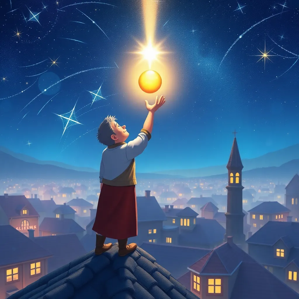 Işık topunu alıp hemen kulübesinin çatısına koştu. Pırıltı, onu görünce sevinçle parladı. 'Onu buldun!' diye şarkı söyledi tüm yıldızlar. Bay Yıldız, ışık topunu gökyüzüne doğru kaldırdı. İnanılmaz bir şey oldu; top, avucundan yükseldi, incecik bir ışık hüzmesi gibi gökyüzüne doğru süzüldü ve doğrudan Pırıltı'ya geri döndü. Pırıltı anında eski parlaklığına, hatta daha da fazlasına kavuştu! O kadar parlak ışıldıyordu ki, tüm kasaba gümüşi bir ışıkla yıkandı. 'Teşekkür ederim, en iyi arkadaşım!' diye fısıldadı Pırıltı. 'Sana bir armağanım var.' Pırıltı'dan kopan küçük bir ışık kıvılcımı, Bay Yıldız'ın cebindeki anahtarlığa kondu ve orada, minik, sönmeyen bir yıldız gibi parlamaya başladı.