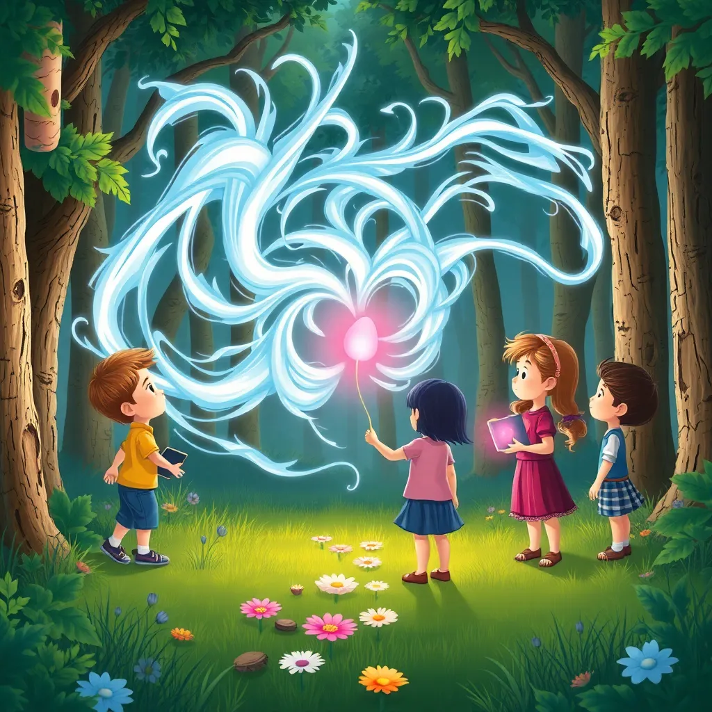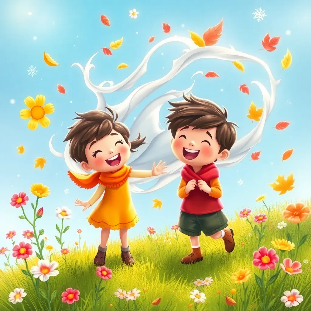 Kardeşler, Mevsim Rüzgarı'nı bulmak için Yağmur Ormanı'nın derinliklerine doğru yola koyuldular. İlkbahar, cebinden çıkardığı pembe tohumu avucunda tuttu. Tohum parladı ve önlerinde çiçekli bir patika belirdi. 'Bunu takip edelim!' dedi. Patika onları, üzgün bir şekilde dönüp duran mavi-beyaz bir rüzgar girdabının yanına götürdü. Bu, kaybolmuş Mevsim Rüzgarı'ydı! Rüzgar, karmakarışık esiyor, bir an sıcak, bir an soğuk, bir an ılık, bir an serin getiriyordu. 'Dur, lütfen dur!' diye seslendi Yaz, ama rüzgar onları duymuyor gibiydi. Sonbahar, 'Belki de ona mevsimleri hatırlatmamız gerekiyor' diye düşündü. 'Hep birlikte tohumlarımızı kullanalım!'