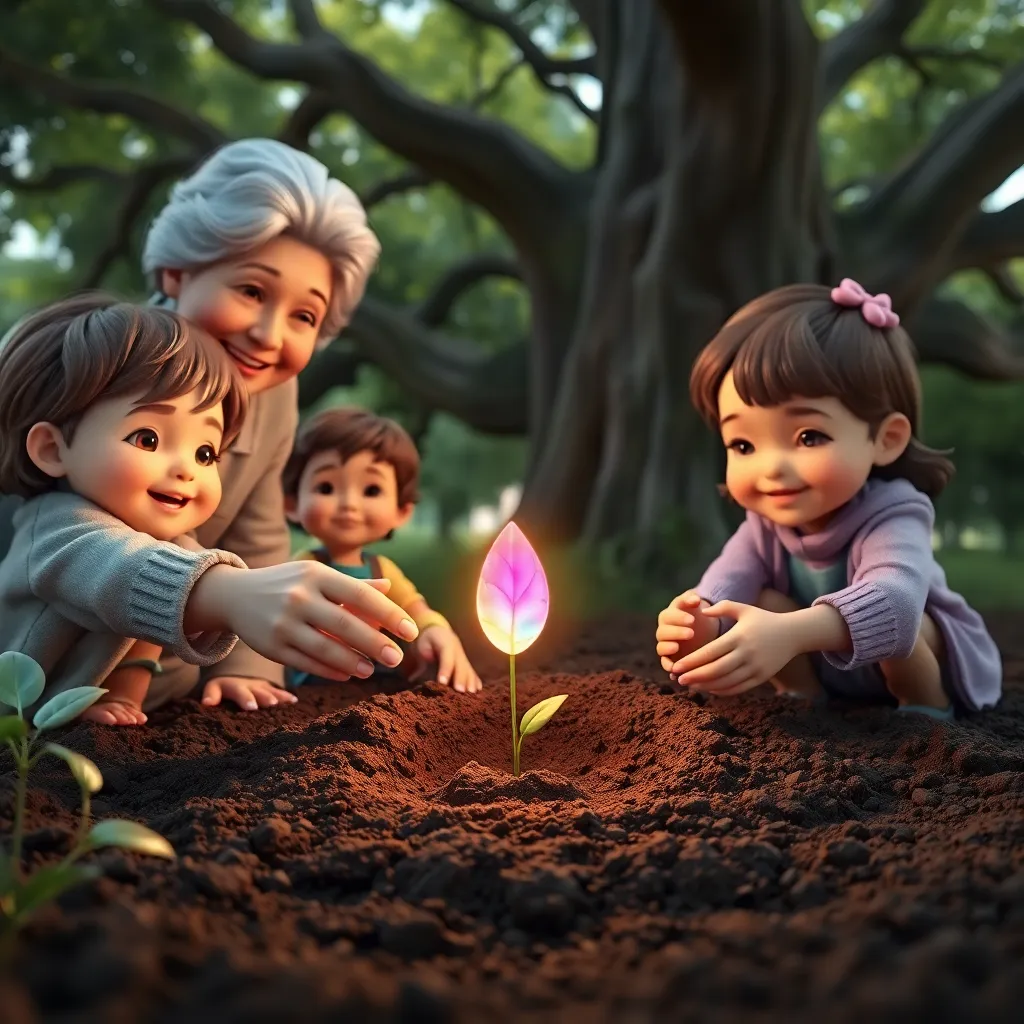 Çocuklar merakla göktaşının yanına dizildiler. Aralarından en cesuru olan Can, yavaşça çatlağı araladı. İçinde, tıpkı bir minik yıldız gibi parlayan, gökkuşağı renklerinde bir tohum vardı! Tohum, elmas kadar parlaktı ve dokununca hafifçe titreşiyordu. Çocuklar ne yapacaklarını bilemediler. Sonra, köyün bilge büyükannesi Gül Nine geldi. Tohumu eline alıp gülümseyerek, 'Bu, çok özel bir hediye. Gökyüzünden gelen bir tohum. Onu sevgiyle toprağa ekmeliyiz,' dedi. Hep birlikte, tarlanın en güzel yerine, bir meşe ağacının gölgesine minik bir çukur kazdılar. Tohumu nazikçe yerleştirip üzerini bereketli toprakla örttüler.