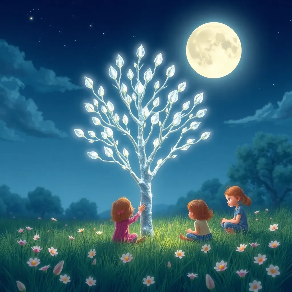 Çocuklar, tohumun büyümesi için her gün sırayla ona su verdiler, şarkılar söylediler ve güzel şeyler anlattılar. Bir hafta sonra, topraktan minik, gümüş yapraklı bir filiz çıktı! Filiz, her gece yıldızlar görününce biraz daha büyüdü ve yaprakları ay ışığında parlıyordu. Bir ay sonra, filiz, boyları çocuklara kadar uzanan, ışıltılı bir fidan olmuştu. Fidanın dallarında, minik kristal gibi tomurcuklar belirdi. Çocuklar sabırsızlıkla çiçek açmasını beklediler. Derken, bir dolunay gecesi, tomurcuklar usulca açılmaya başladı. Açılan çiçekler, gökyüzündeki takımyıldızlar gibi biçimlenmişti ve her biri farklı bir pastel renkte parlıyordu: pembemsi, mavimsi, lavanta rengi.