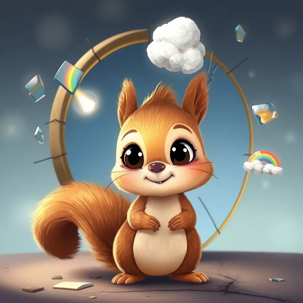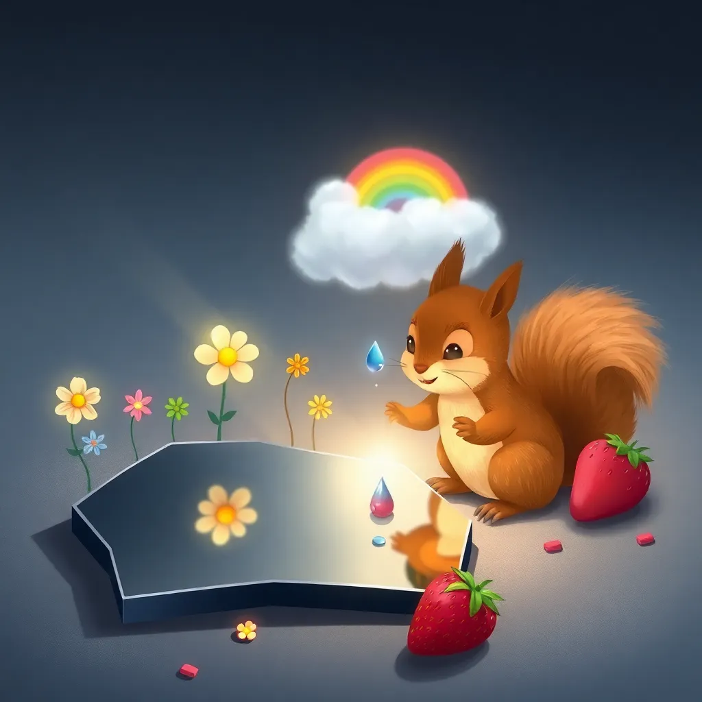 Bir gün, meraklı bir sincap yavrusu, ormanda koştururken bu gizemli aynanın önüne geldi. Sincap, aynadaki kendi yansımasını görünce çok şaşırdı. Burnunu aynaya yaklaştırdı ve tam o sırada hafif bir esinti, aynanın en küçük parçalarından birini salladı. İçinden minik Pırıltı dışarı fırladı! Pırıltı, sincabın kürkünün üzerinde zıplayan bir ışık topu gibiydi. Sincap çok heyecanlandı. Pırıltı, sincaba diğer yansımaların da dünyasını gösterdi. Gökkuşağı, sincabın kuyruğuna minik bir renk şeridi sardı. Başka bir parçadan çıkan Bulutcuk, sincabın başının üstünde minik bir gölge yaptı. Sincap, bu yeni arkadaşlarıyla oynamaya bayıldı. Ama sonra, aynanın en büyük ve en karanlık görünen parçasına baktı. O parçada hiçbir yansıma yoktu, sadece loş bir gri ışık vardı. Bu, herkesi biraz üzdü.